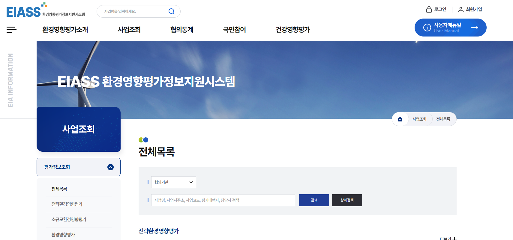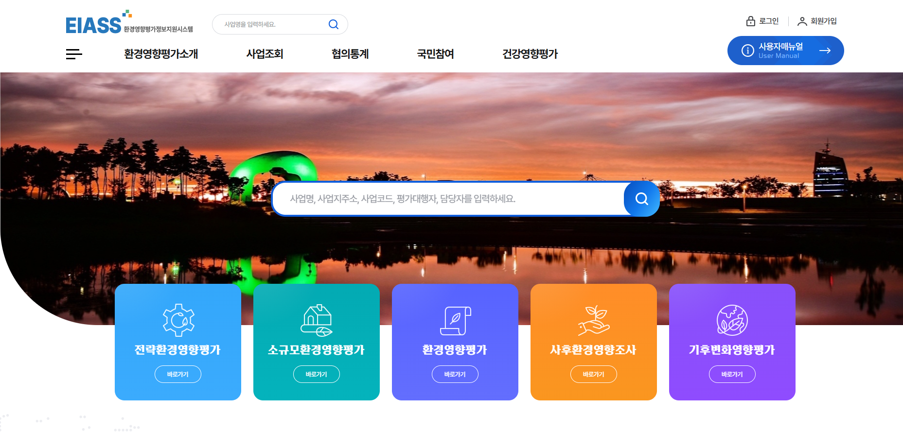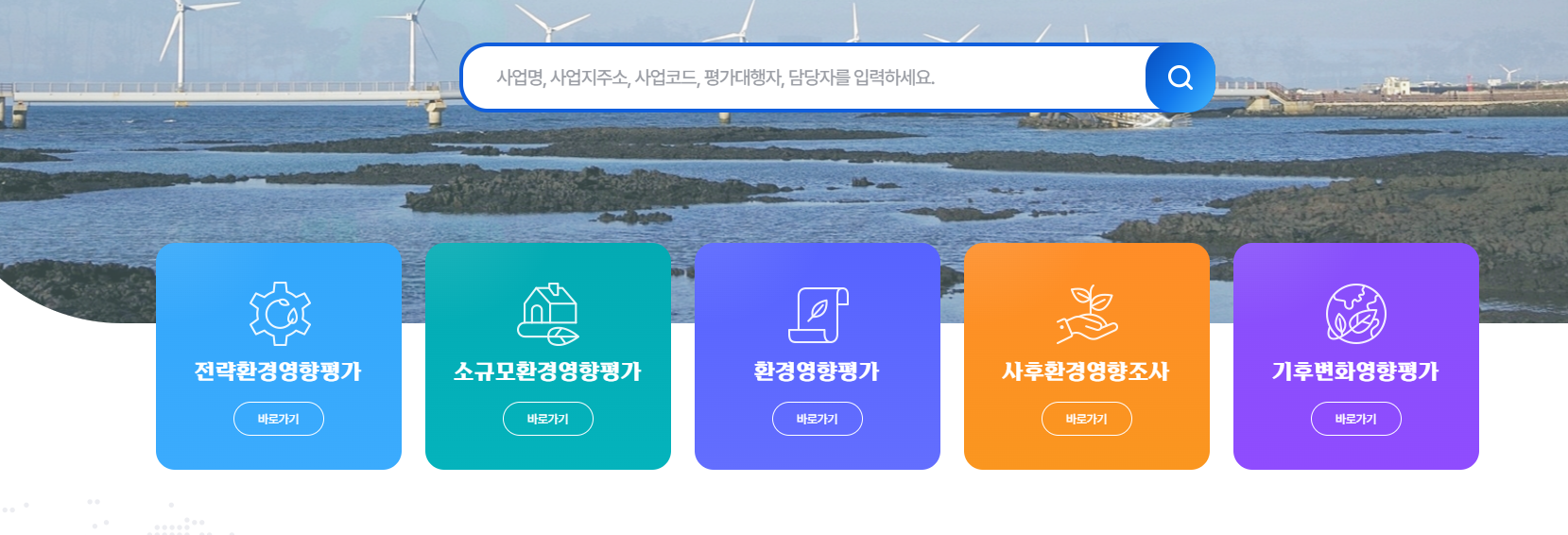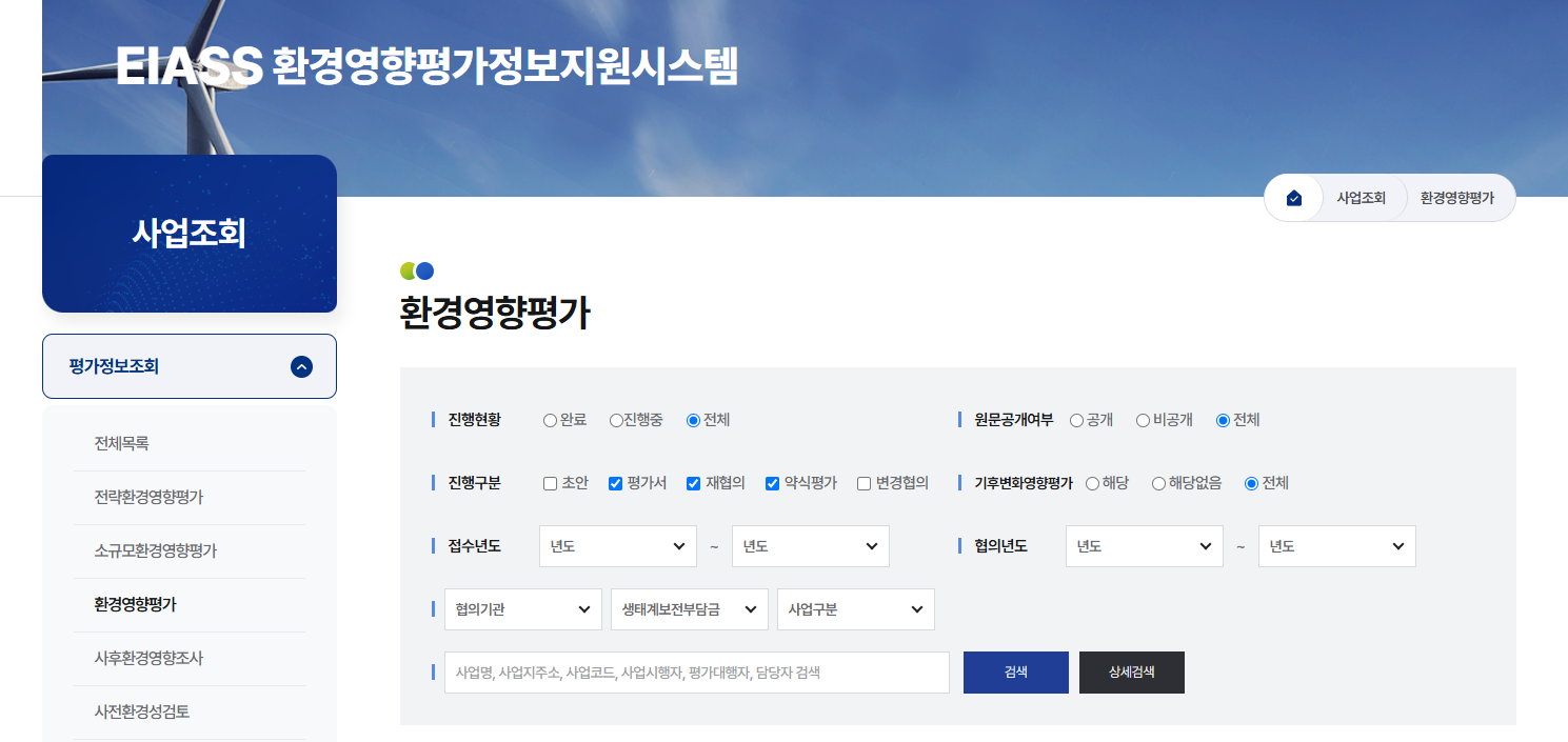 환경영향평가정보지원시스템에서 가장 핵심적인 기능은 바로 사업 조회입니다. 이 메뉴를 통해 특정 사업의 환경영향평가 진행 현황, 평가서 내용, 협의 내용 등을 상세하게 확인할 수 있습니다.