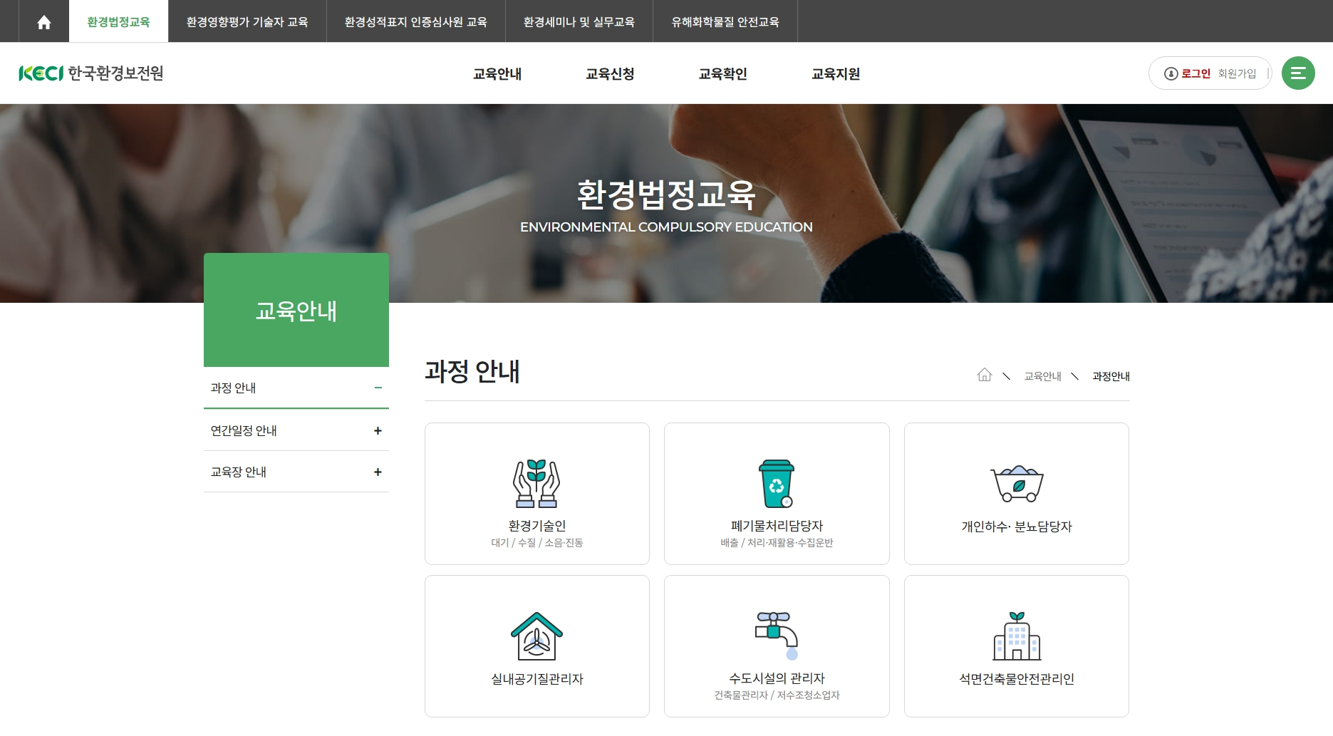 교육 과정 검색 : 로그인 후, 상단 메뉴의 [법정교육] 또는 [교육과정] 메뉴를 클릭하여 수강하고자 하는 교육 과정을 검색합니다. 본인에게 해당하는 교육 유형(예: 폐기물, 대기, 수질 등)을 잘 확인해야 합니다. 검색 기능을 활용하여 필요한 교육 과정을 빠르게 찾을 수 있습니다.