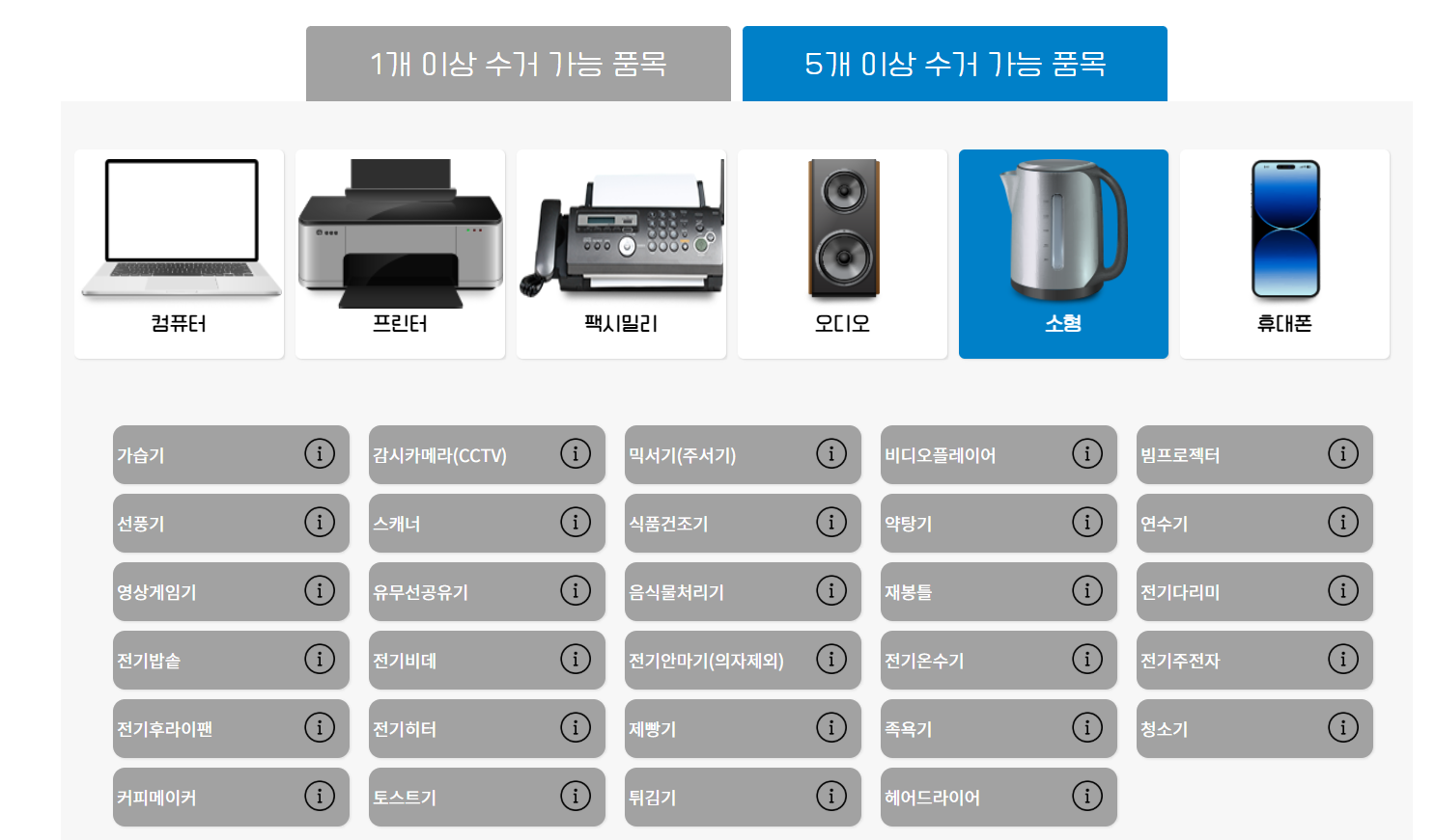 선풍기, 청소기, 휴대폰, 커피메이커, 전기밥솥 등 작은 가전제품들은 단독으로 신청할 수 없으며, 반드시 묶어서 5개 이상이 되어야만 신청이 가능합니다. 이 점을 꼭 기억해 주세요.