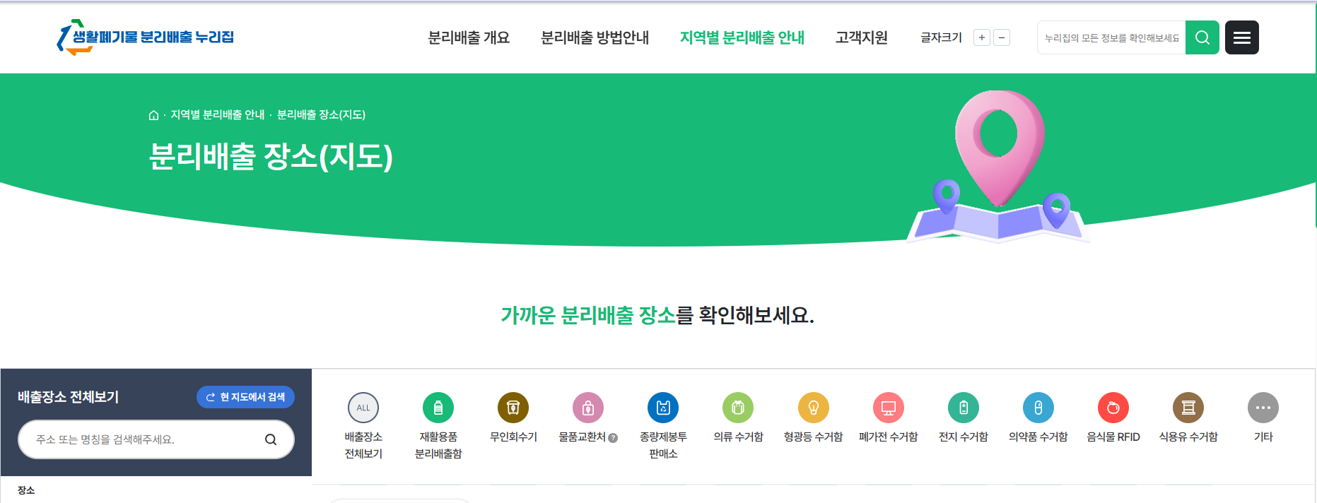 모바일 접속 시, 위치 정보 기반으로 주변의 재활용품 공동배출장소, 폐건전지/형광등 수거함 위치 등을 지도 형태로 안내받을 수 있습니다.